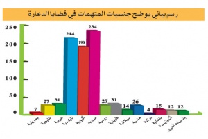 وأشارت الإحصائية إلى أن «عدد المتهمات في قضايا الآداب العامة بلغ في العام 2009 (844 متهمة)، احتلت الصينيات المركز الأول بينهن، إذ بلغ عدد المتهمات منهن 234 متهمة، في حين جاءت التايلنديات بالمرتبة الثانية وبلغ عددهن 214، وحلت المتهمات الأثيوبيات ثالثاً بـ 190 متهمة».